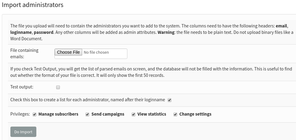 Instead of adding multiple admins one-by-one, you can import a list of admins directly by importing a file. The columns need to have the following headers: email, loginname, password. Any other columns will be added as admin attributes. Warning: the file needs to be plain text. Do not upload binary files like a Word Document.
